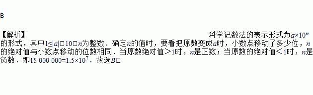 B 【解析】科学记数法的表示形式为a×10n的形式,其中1≤|a|<10,n为整数.确定n的值时,要看把原数变成a时,小数点移动了多少位,n的绝对值与小数点移动的位数相同.当原数绝对值>1时,n是正数;当原数的绝对值<1时,n是负数.即15 000 000=1.5×107.故选B.