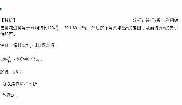 某种商品的进价为80元,出售时标价为120元,后来由于该商品积压,商店准备打折出售,但要保证利润率不低于5%,则至多可打( )
