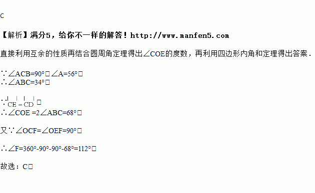 如图,在Rt△ABC中,∠ACB=90°,∠A=56°.以BC为直径的⊙O交AB于点D.E是⊙O上一点,且