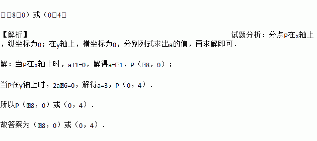 已知点P(2a﹣6,a+1),若点P在坐标轴上,则点P的坐标为________.