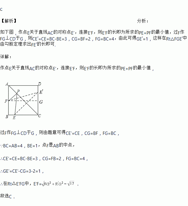 如图,正方形ABCD的边长为4,E为BC上的一点,BE=1,F为AB的中点,P为AC上一个动点,则PF+PE的最小值为( )