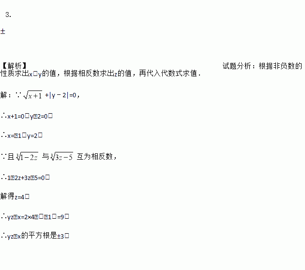 已知+|y﹣2|=0,且与互为相反数,求yz﹣x的平方根.