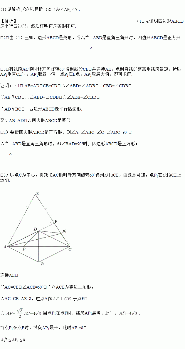 (3)对角线AC和BD交于点O,∠ ADC =120°,AC=8, P为对角线AC上的一个动点,连接DP,将DP绕点D逆时针方向旋转120°得到线段DP1,直接写出A P1的取值范围.