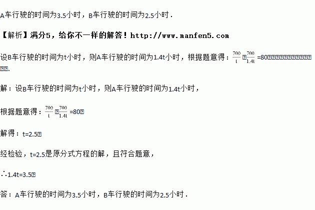 徐州至北京的高铁里程约为700km,甲、乙两人从徐州出发,分别乘坐“徐州号”高铁A与“复兴号”高铁B前往北京.已知A车的平均速度比B车的平均速度慢80km/h,A车的行驶时间比B车的行驶时间多40%,两车的行驶时间分别为多少?
