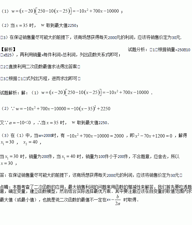 (3)在保证销售量尽可能大的前提下,该商场想获得每天2000元的利润,应该将销售价定为多少元?