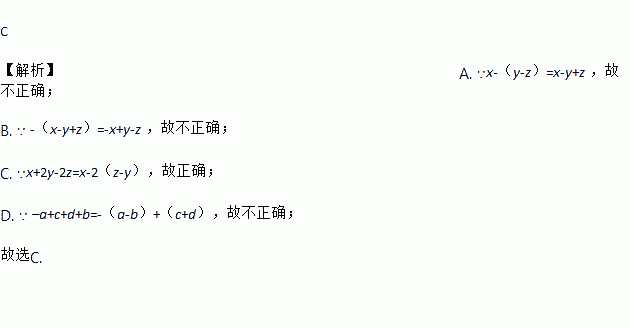 C 【解析】A. ∵x-(y-z)=x-y+z ,故不正确; B. ∵ -(x-y+z)=-x+y-z ,故不正确; C. ∵x+2y-2z=x-2(z-y),故正确; D. ∵ –a+c+d+b=-(a-b)+(c+d),故不正确; 故选C.