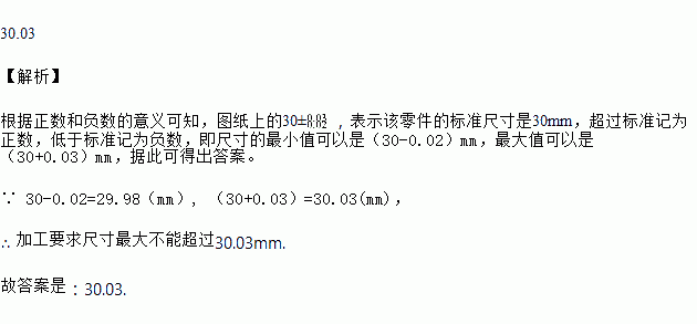 一种零件的直径尺寸在图纸上是30±(单位:mm),它表示这种零件的标准尺寸是30mm,加工要求尺寸最大不超过_____mm.