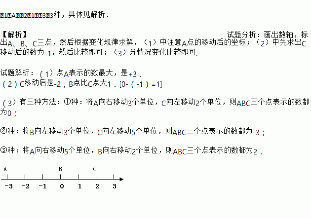 (1)A;(2)1;(3)3种,具体见解析. 【解析】试题分析:画出数轴,标出A、B、C三点,然后根据变化规律求解,(1)中注意A点的移动后的坐标;(2)中先求出C移动后的数为-1,然后比较即可;(3)分情况变化比较即可. 试题解析:(1)点A表示的数最大,是+3. (2)C移动后是-2,B点比C点大1.[0-(-1)=1] (3)有三种方法:①种:将A向右移动3个单位,C向左移动...计算
