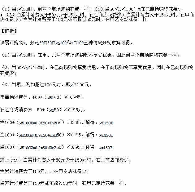 甲、乙两商场以同样价格出售同样的商品,并且又各自推出不同的优惠方案:在甲商场累计购物超过100元后,超出100元的部分按90%收费;在乙商场累计购物超过50元后,超出50元的部分按95%收费.若顾客购物应付x元,请根据x的取值,讨论顾客到哪家商场购物花费少?