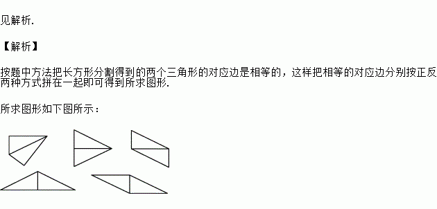 将一个长方形按下列方法分割得到两个三角形,将两个三角形相等的边重合,请尽可能多地拼出不同的图形.(至少画出三种)
