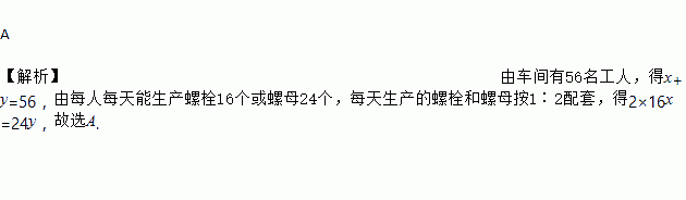 某车间有56名工人,每人每天能生产螺栓16个或螺母24个,设有x名工人生产螺栓,y名工人生产螺母,每天生产的螺栓和螺母按1∶2配套,下面所列方程组正确的是( )