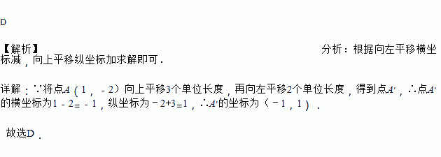在平面直角坐标系中,将点向上平移3个单位长度,再向左平移2个单位长度,得到点A',则点A'的坐标是( )