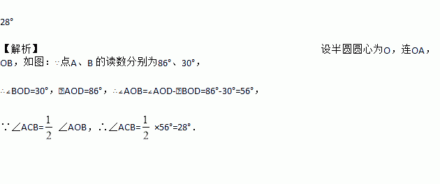 将量角器按如图所示的方式放置在三角形纸板上,使点C在半圆上.点A、B的读数分别为86°、30°,则∠ACB =________.