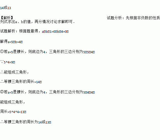 14或13 【解析】试题分析:先根据非负数的性质列式求出a、b的值,再分情况讨论求解即可. 试题解析:根据题意得,a﹣b﹣1=0,b﹣4=0, 解得a=5,b=4, ①若a=5是腰长,则底边为4,三角形的三边分别为5、5、4, ∵5+4=9, ∴能组成三角形, ∴等腰三角形的周长=14; ②若a=5是腰长,则底边为4,三角形的三边分别为5、4、4, ...