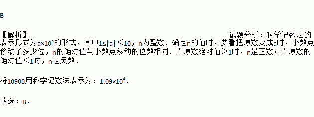 B 【解析】试题分析:科学记数法的表示形式为a×10n的形式,其中1≤|a|<10,n为整数.确定n的值时,要看把原数变成a时,小数点移动了多少位,n的绝对值与小数点移动的位数相同.当原数绝对值>1时,n是正数;当原数的绝对值<1时,n是负数. 将10900用科学记数法表示为:1.09×104. 故选:B.