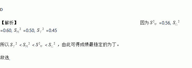 D 【解析】因为=0.56, =0.60, =0.50, =0.45 所以<<<,由此可得成绩最稳定的为丁。 故选.