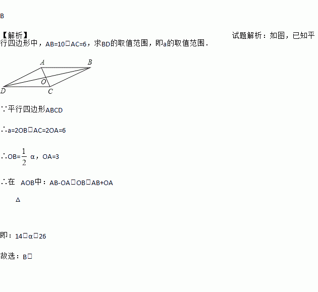 已知平行四边形一边长为10,一条对角线长为6,则它的另一条对角线α的取值范围为( )