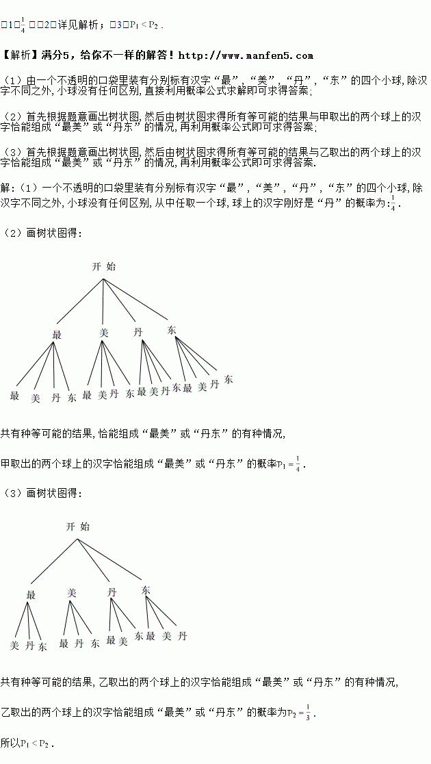 (2)甲从中任取一球,记下汉字后再放回袋中,然后再从中任取一球,请用树状图或列表格的方法,求出甲取出的两个球上的汉字恰能组成“最美”或“丹东”的概率为P1;