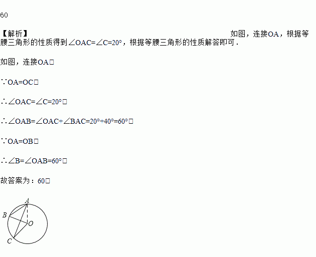 如图,点A,B,C在⊙O上,∠A=40度,∠C=20度,则∠B=_____度.