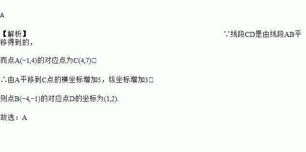 已知线段CD是由线段AB平移得到的,点A(﹣1,4)的对应点为C(4,7),则点B(﹣4,﹣1)的对应点D的坐标为( )