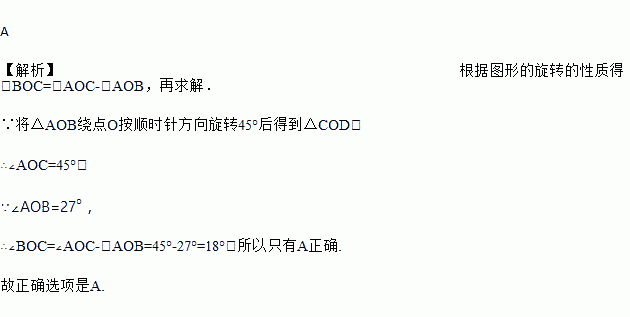 如图,将△AOB绕点O按顺时针方向旋转45°后得到△COD,若∠AOB=27°,则∠BOC的度数是( )