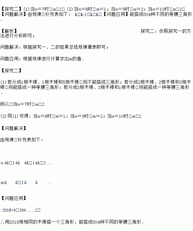 不妨假设能搭成m种不同的等腰三角形,为探究m与n之间的关系,我们可以先从特殊入手,通过试验、观察、类比、最后归纳、猜测得出结论.