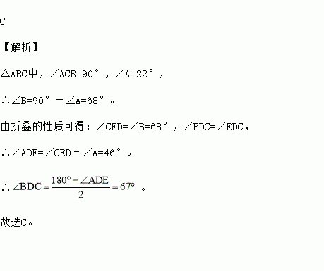 如图,△ABC中,∠ACB=90°,沿CD折叠△CBD,使点B恰好落在AC边上的点E处.若∠A=22°,则∠BDC等于