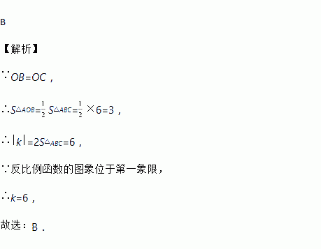 图象上一点, AB⊥x轴于点B,点C在x轴上,且OB=OC,若△ABC的面积等于6,则的值等于( )![]()