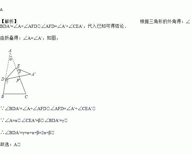如图,将一张三角形纸片ABC的一角折叠,使点A落在△ABC外的A'处,折痕为DE.如果∠A=α,∠CEA′=β,∠BDA'=γ,那么下列式子中正确的是( )