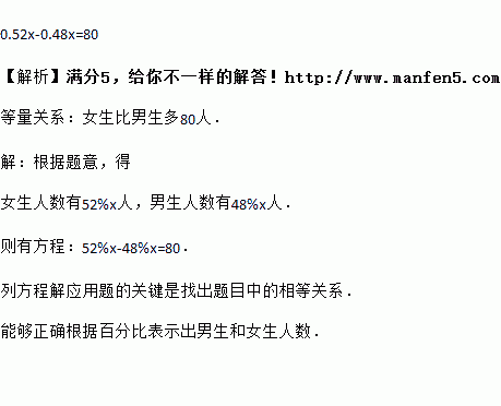 已知某校的女生占全体学生人数的52%且比男生多80人.若设这个学校的全体学生人数为x,则可列出方程 .