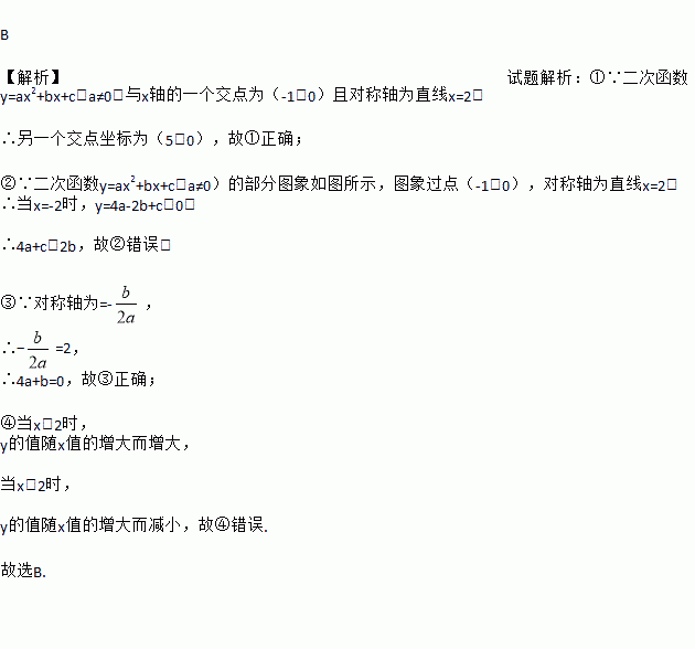 B 【解析】试题解析:①∵二次函数y=ax2+bx+c(a≠0)与x轴的一个交点为(-1,0)且对称轴为直线x=2, ∴另一个交点坐标为(5,0),故①正确; ②∵二次函数y=ax2+bx+c(a≠0)的部分图象如图所示,图象过点(-1,0),对称轴为直线x=2, ∴当x=-2时,y=4a-2b+c<0, ∴4a+c<2b,故②错误; ③∵对称轴为=-, ∴?=2, ...