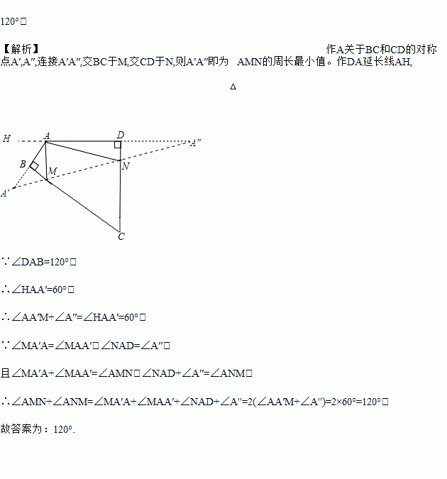 如图,在四边形ABCD中,∠BAD=120°,∠B=∠D=90°,在BC,CD上分别取一点M,N,使△AMN的周长最小,则∠AMN+∠ANM的度数为____________