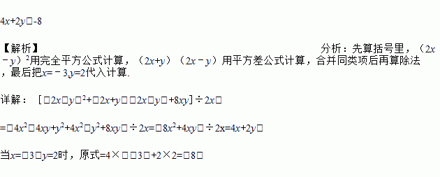 先化简再求值[(2x﹣y)2+(2x+y)(2x﹣y)+8xy]÷2x,其中x=﹣3,y=2。