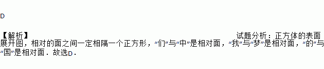 D 【解析】试题分析:正方体的表面展开图,相对的面之间一定相隔一个正方形,“们”与“中”是相对面,“我”与“梦”是相对面,“的”与“国”是相对面.故选D.