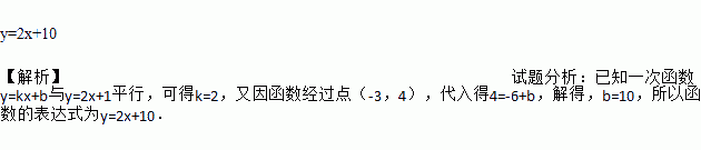 一次函数y=kx+b与y=2x+1平行,且经过点(-3,4),则表达式为:_________________