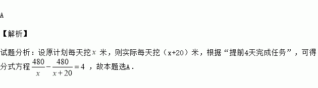 某农场挖一条480米的渠道,开工后,每天比原计划多挖20米,结果提前4天完成任务,若设原计划每天挖米,那么下列方程正确的是( )