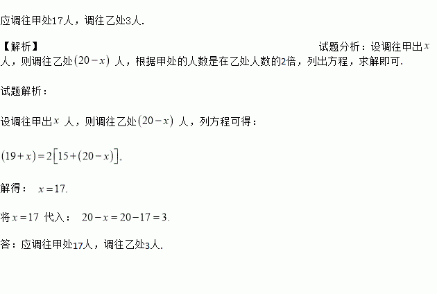 应调往甲处17人,调往乙处3人. 【解析】试题分析:设调往甲出人,则调往乙处人,根据甲处的人数是在乙处人数的2倍,列出方程,求解即可. 试题解析: 设调往甲出人,则调往乙处人,列方程可得: 解得: 将代入: 答:应调往甲处17人,调往乙处3人.