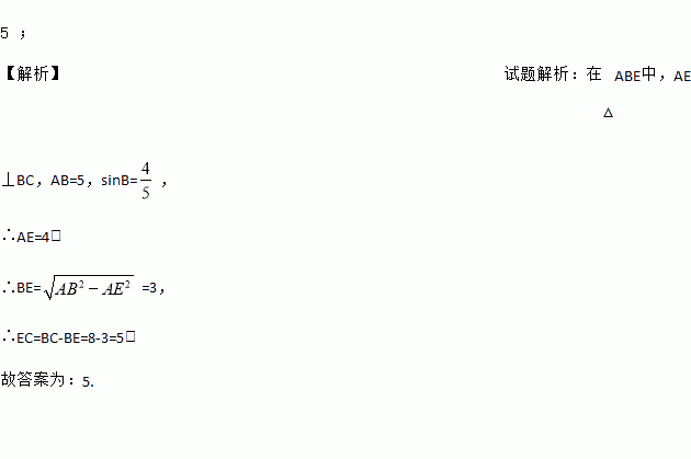 如图,在平行四边形ABCD中,AE⊥BC,垂足为E,如果AB=5,BC=8, ,那么EC=_________.