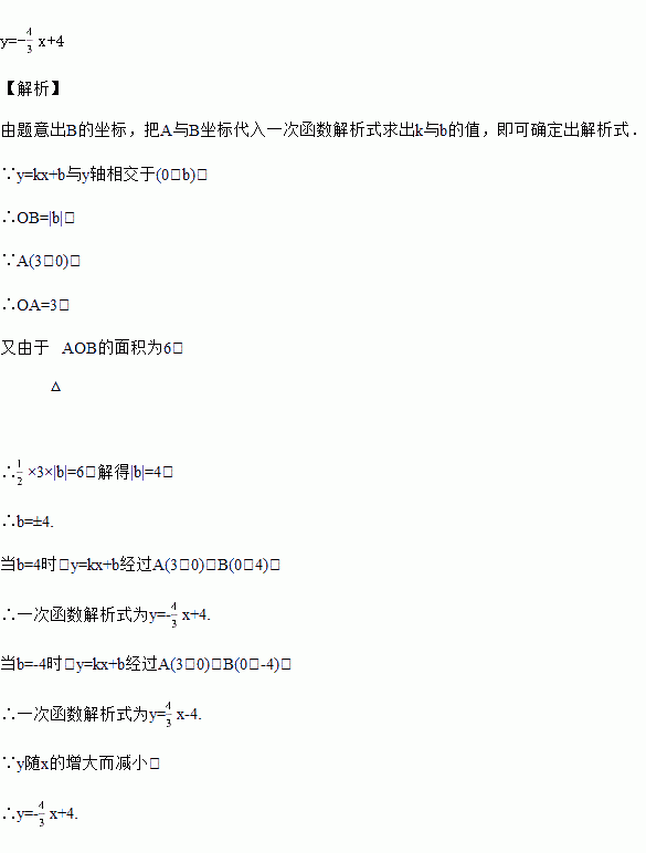 已知一次函数y=kx+b的图象经过点A(3,0),与y轴交于点B,若△AOB的面积为6,且y随x的增大而减小,试求这个一次函数的解析式.