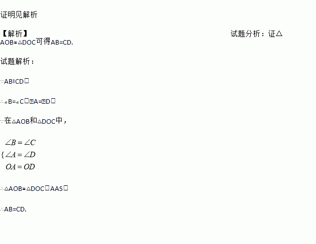 已知:如图,AD,BC相交于点O,OA=OD,AB∥CD.求证:AB=CD.