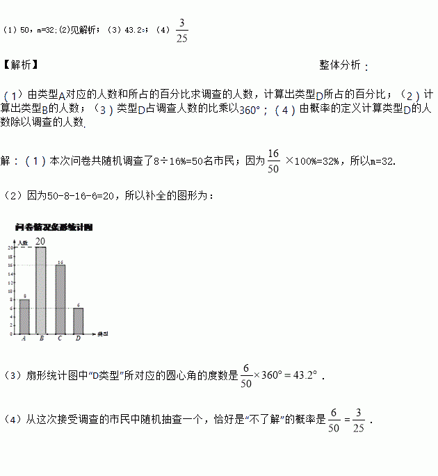 (4)从这次接受调查的市民中随机抽查一个,恰好是“不了解”的概率是 。