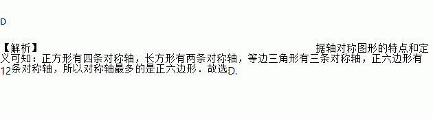 D 【解析】据轴对称图形的特点和定义可知:正方形有四条对称轴,长方形有两条对称轴,等边三角形有三条对称轴,正六边形有12条对称轴,所以对称轴最多的是正六边形.故选D.