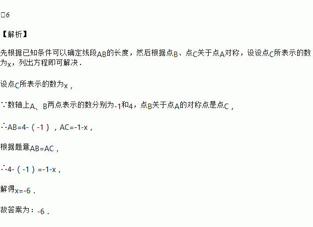 如图,在数轴上,点A表示的数为﹣1,点B表示的数为4,C是点B关于点A的对称点,则点C表示的数为______.