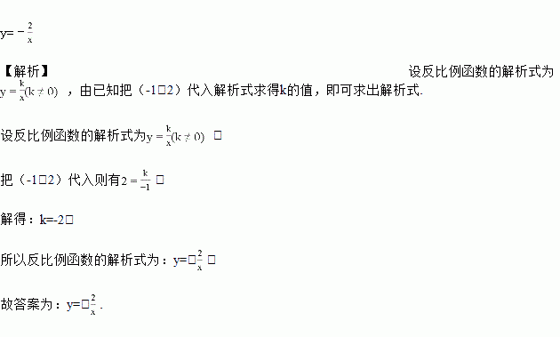 反比例函数的图象经过点P(﹣1,2),则此反比例函数的解析式为________.