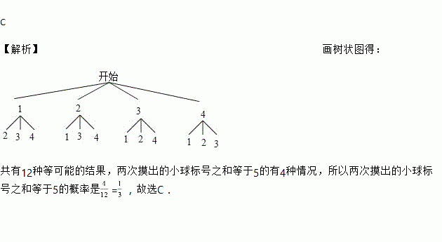 一个不透明的口袋中有四个完全相同的小球,把它们分别标号为1,2,3,4,随机摸出一个小球后不放回,再随机摸出一个小球,则两次摸出的小球标号之和等于5的概率为( )