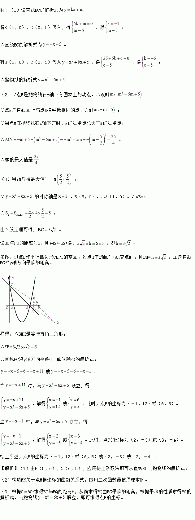 (3)在(2)的条件下,MN取得最大值时,若点P是抛物线在x轴下方图象上任意一点,以BC为边作平行四边形CBPQ,设平行四边形CBPQ的面积为S1,△ABN的面积为S2,且S1=6S2,求点P的坐标。