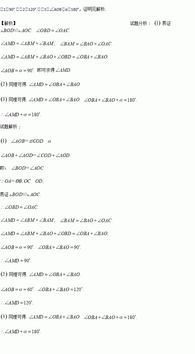 (3)如图3,当△OCD绕O点任意旋转时,∠AMD与α是否存在着确定的数量关系?如果存在,请你用表示∠AMD,并用图3进行证明;若不确定,说明理由.