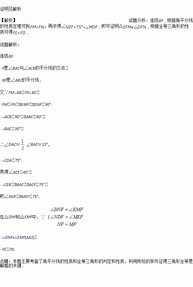 如图,在直角三角形ABC中,∠ACB=90°,∠B=60°,AD,CE是角平分线,AD与CE相交于点F,FM⊥AB,FN⊥BC,垂足分别为M,N.求证:FE=FD.