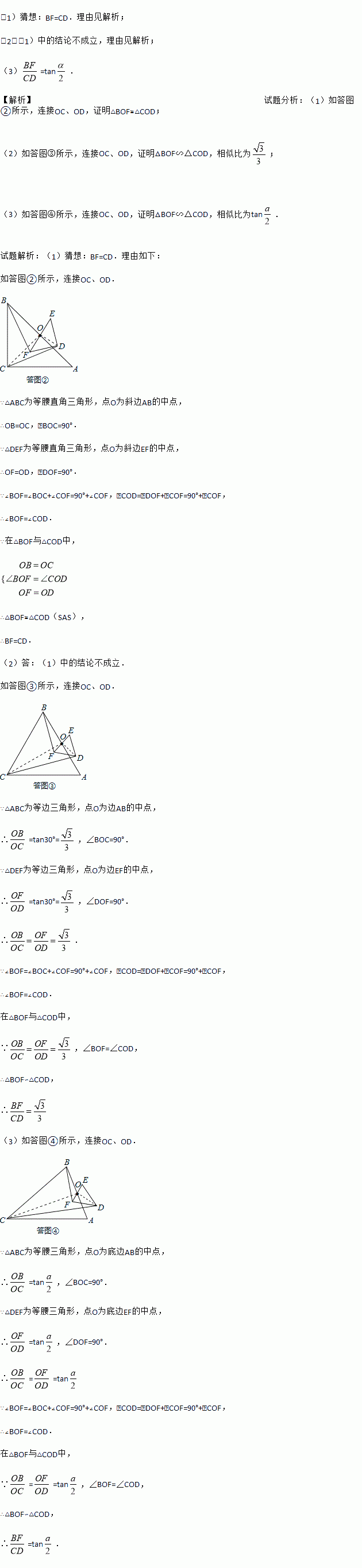 (3)如图④,若△ABC与△DEF都是等腰三角形,AB、EF的中点均为0,且顶角∠ACB=∠EDF=α,请直接写出