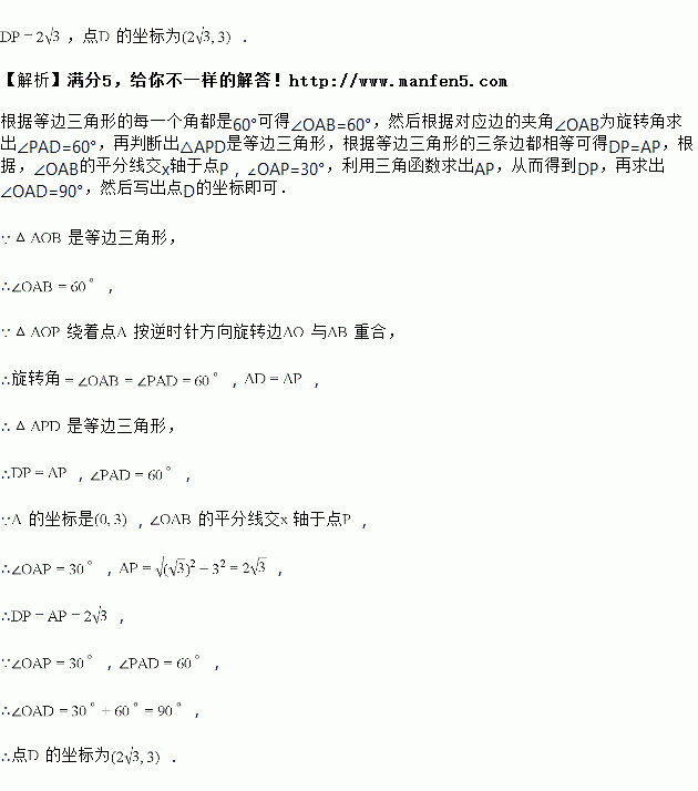 如图,在平面直角坐标系中,已知是等边三角形,点的坐标是,点在第一象限,的平分线交轴于点,把绕着点按逆时针方向旋转,使边与重合,得到,连接.求:的长及点的坐标.